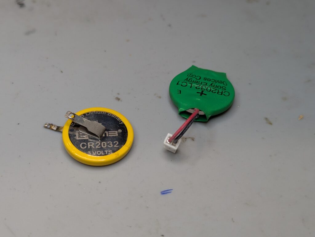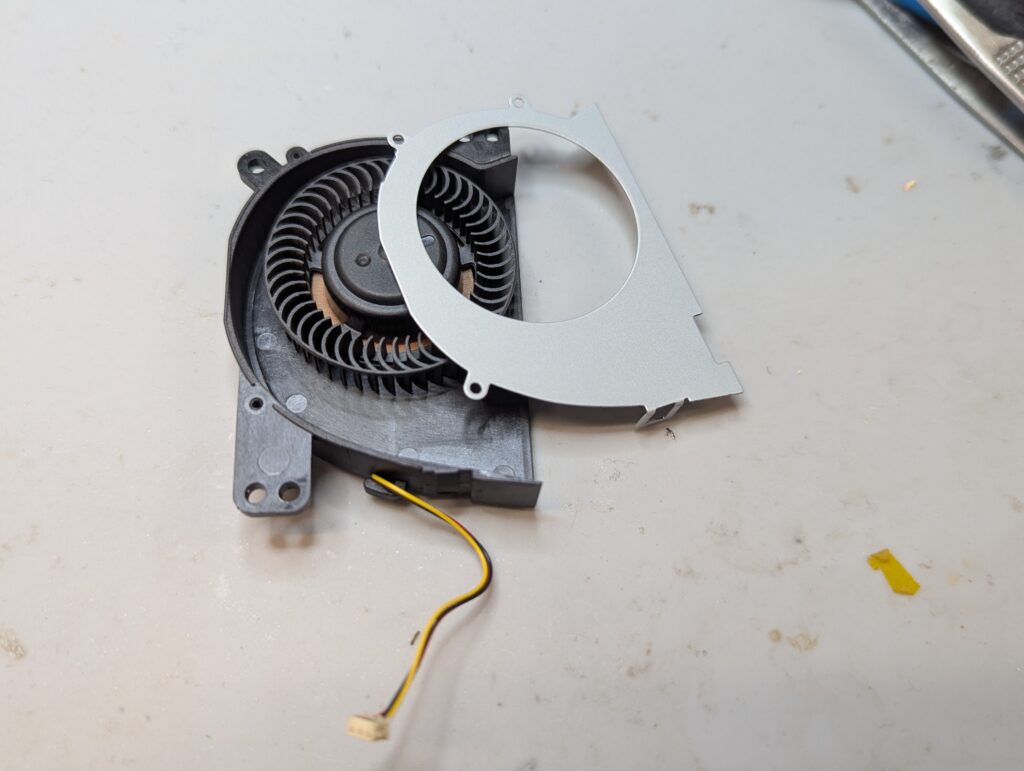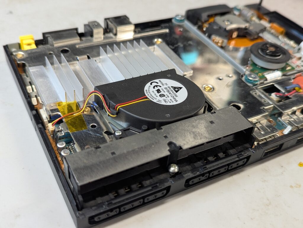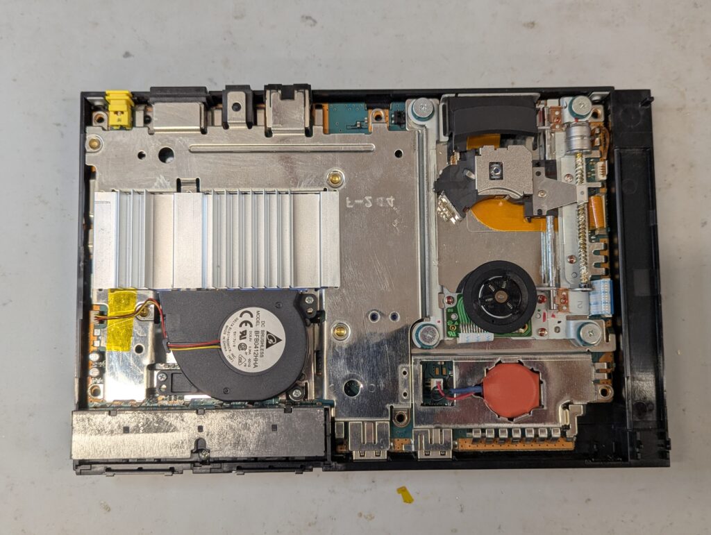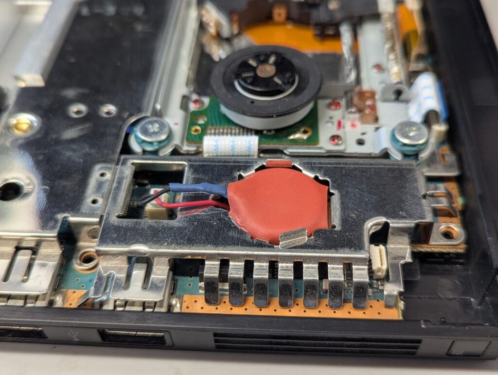 The fan was partially disassembled for easier cleaning. Again, somewhat dusty but not very dirty. For the battery, in Slim PS2s the connector is soldered to the it, so the best way to replace the battery is to remove the connector, solder it to a new battery, and protect it with shrink tube