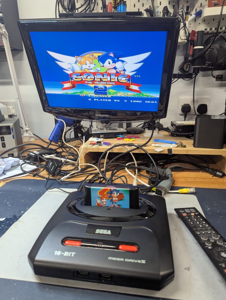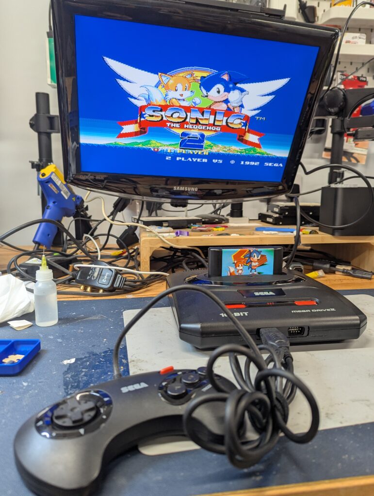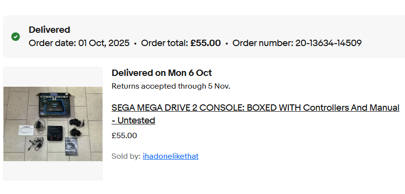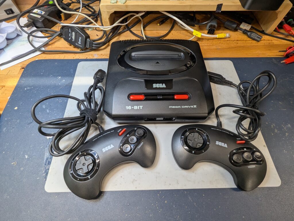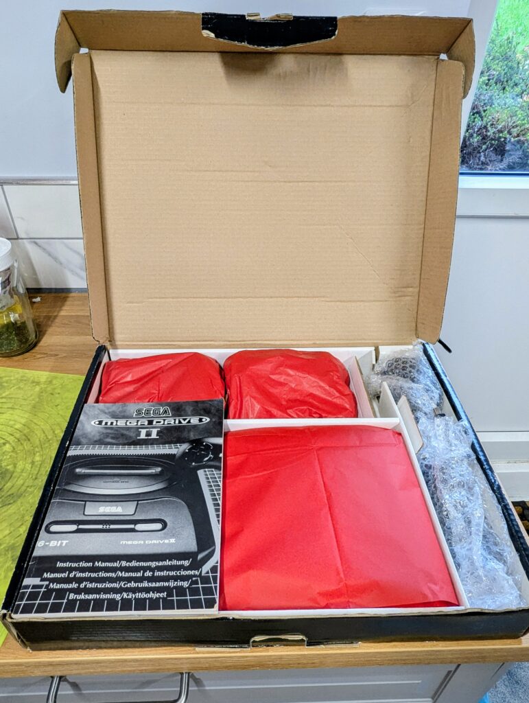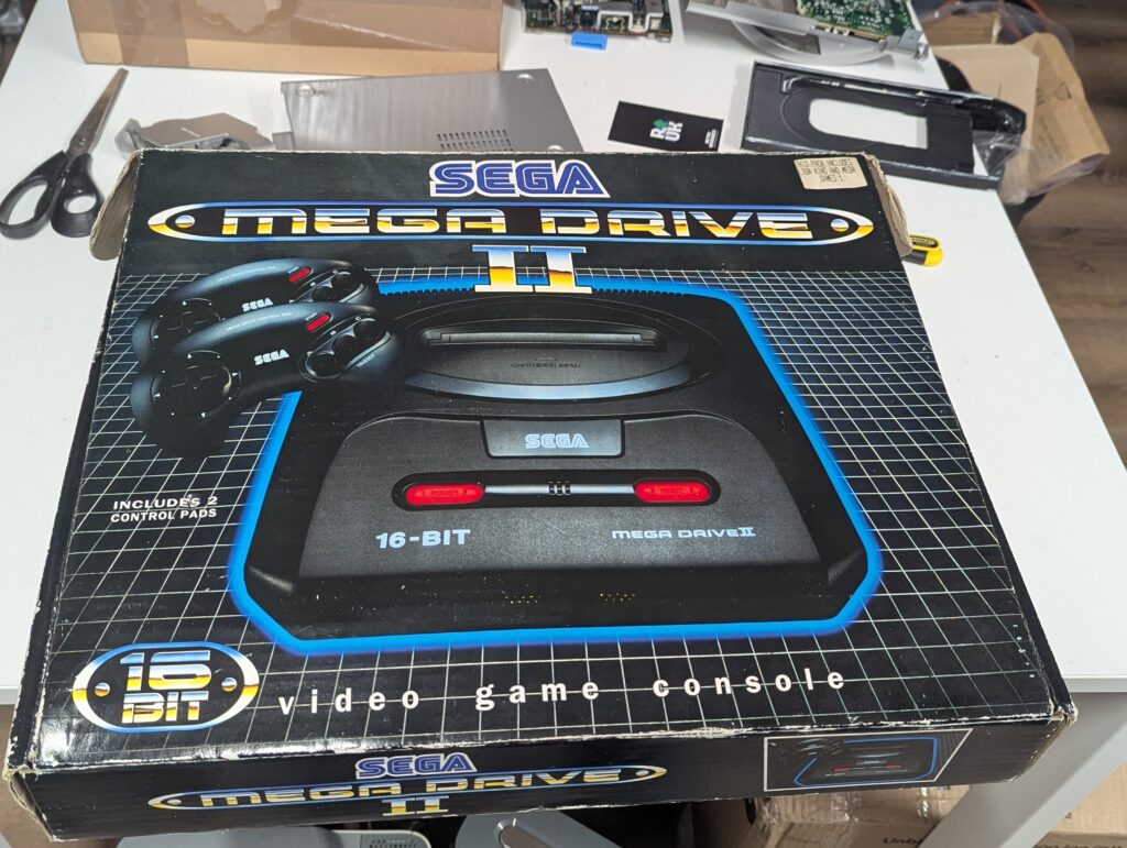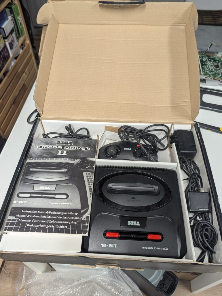 The order was for sourcing and modding a Sega Genesis model 2, and it was agreed with the customer to source one with two controllers. The console sourced came with a box and manuals, marked as untested but on arrival it tested just fine.