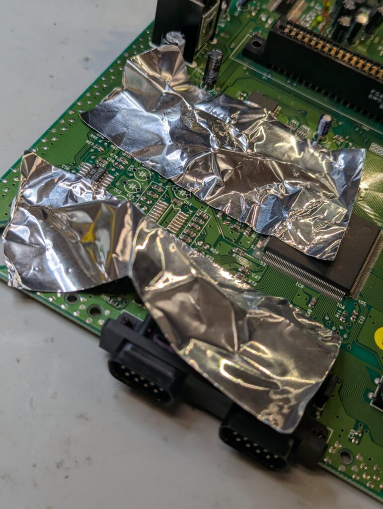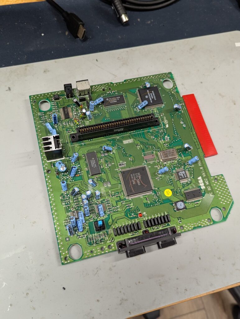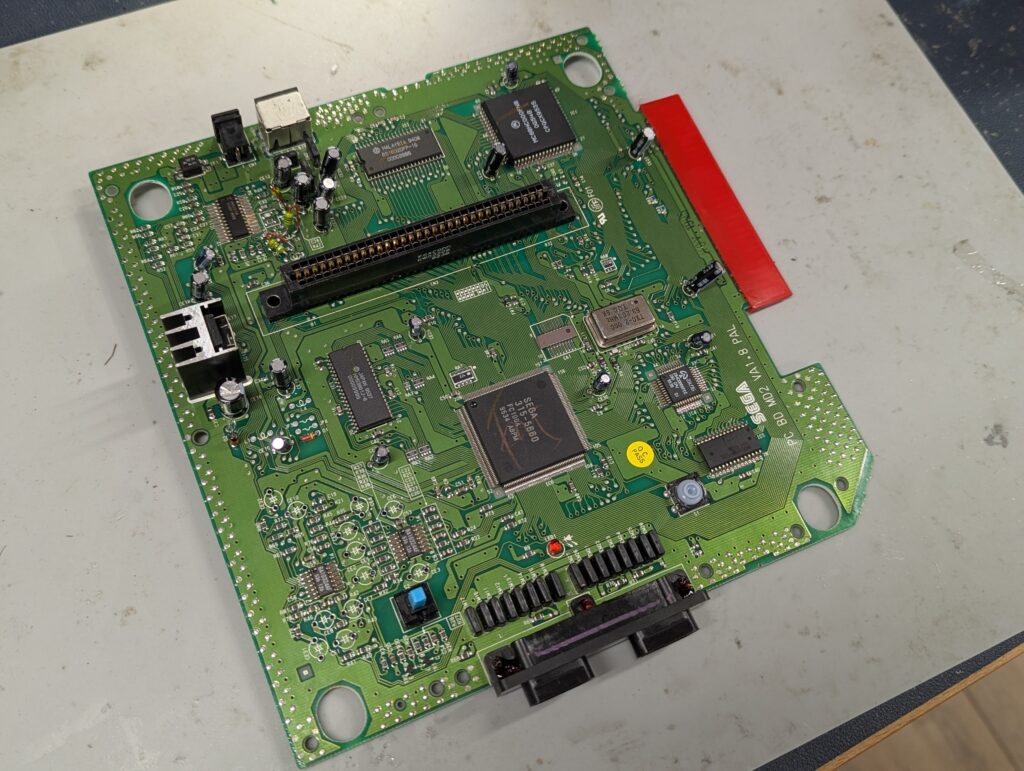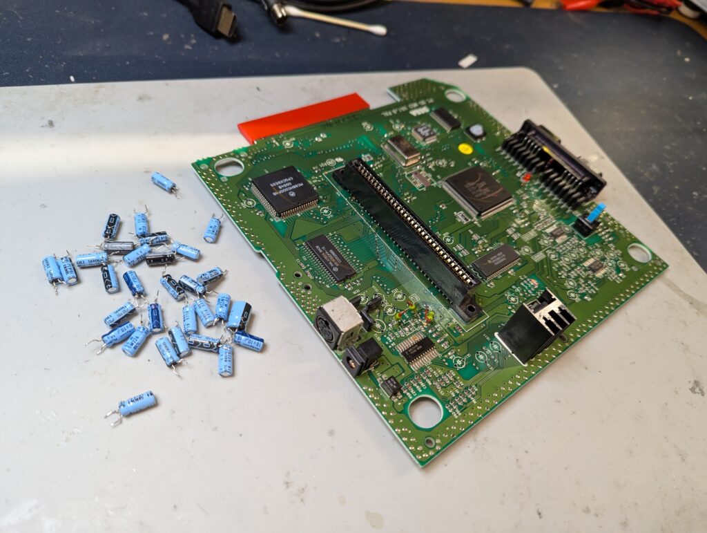 The console itself was in good condition and tested well first time using a Scart cable. The shield had no signs of rust and it was overall in a good clean state. The capacitors were removed and new capacitors were put back apart from the ones that need to be removed for the triple bypass.