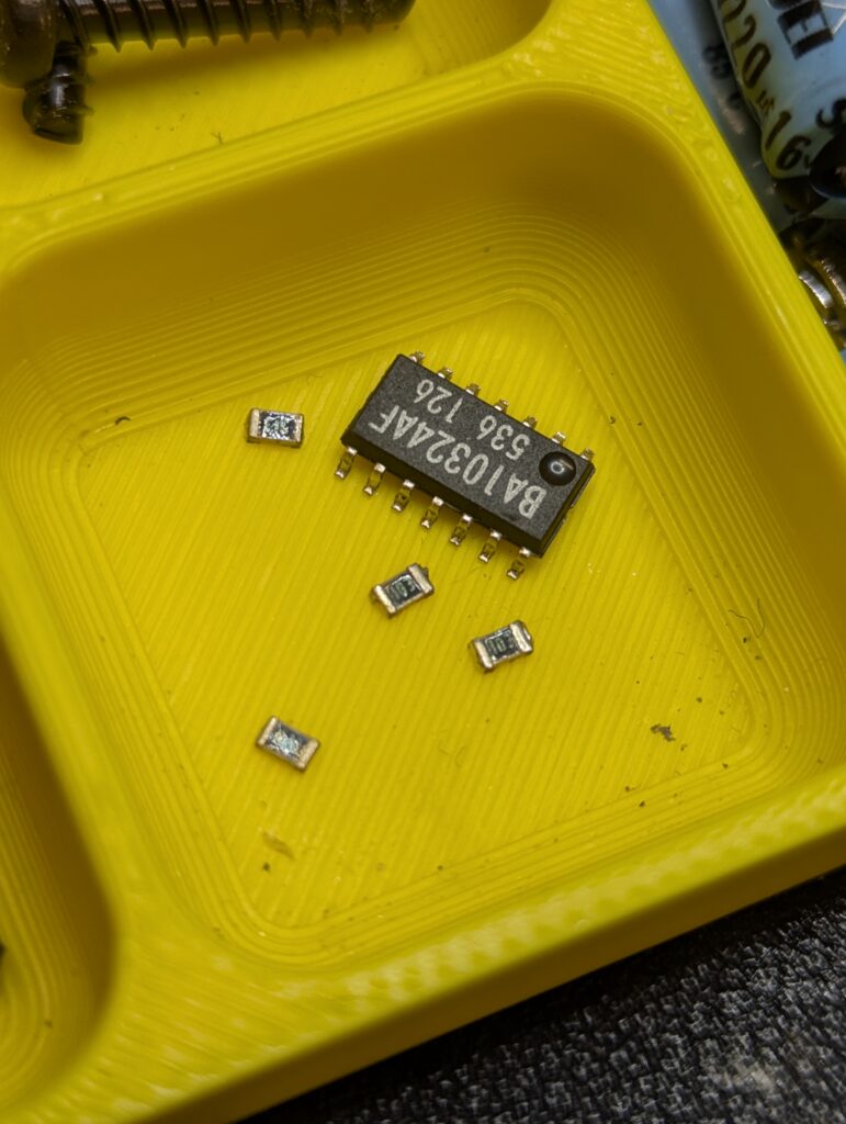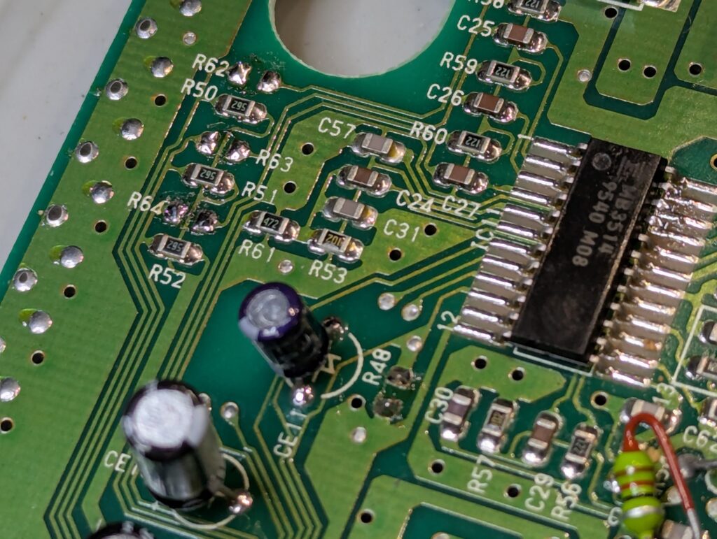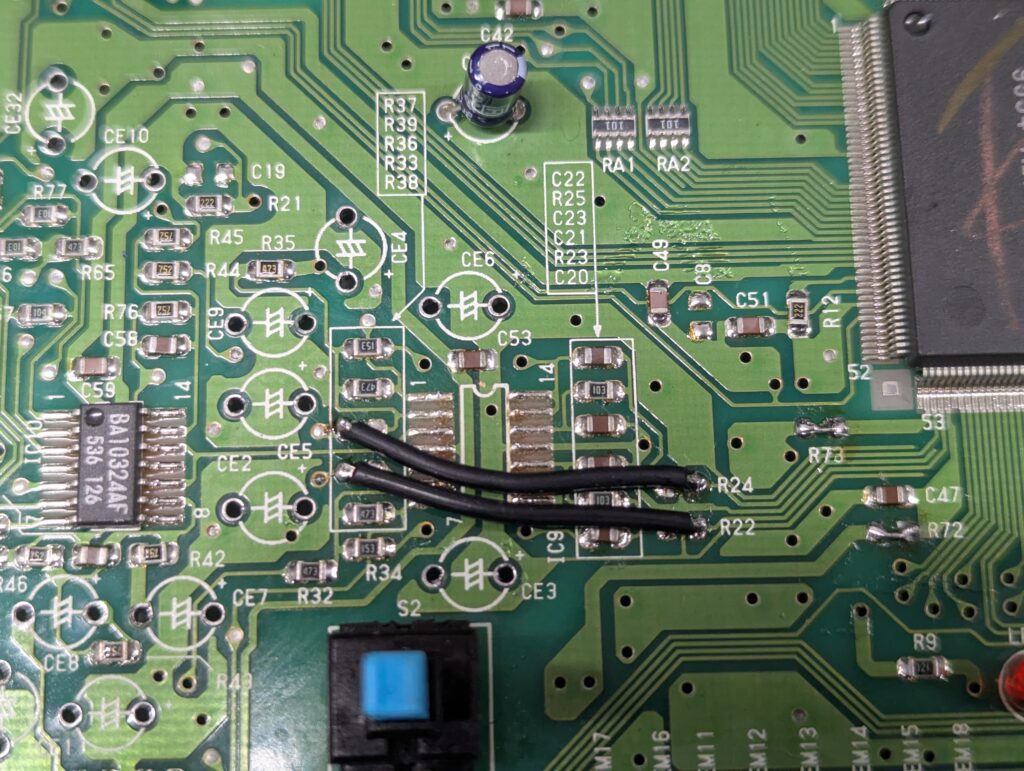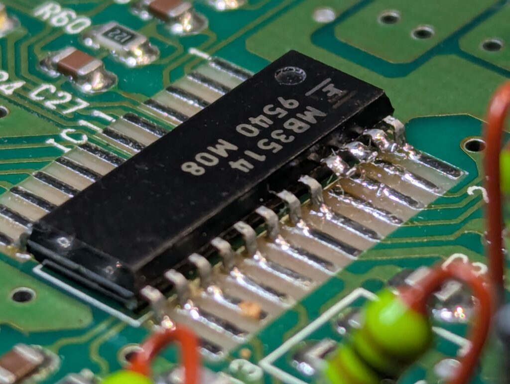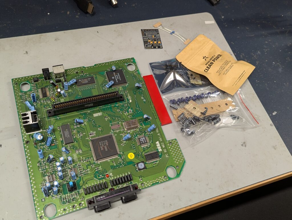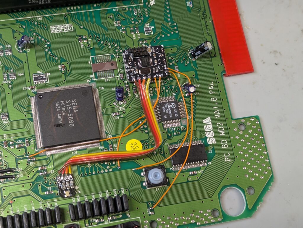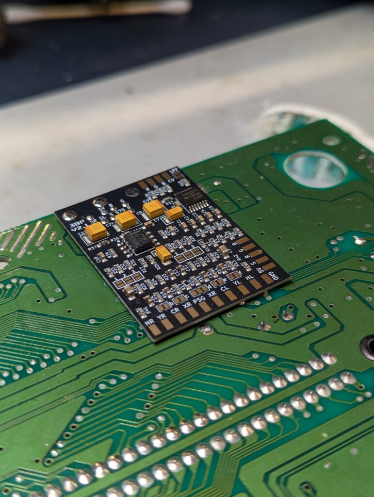 The board used from RetroUpgrades includes is a version 2.1 and includes composite rebuild, which was also performed. The first step of the installation process was to remove a number of components, including a chip and various SMD capacitors. Some of them were removed with hot air, others with the soldering iron. The mod also requires to lift three pins from the video chip, bridge the pad of two of the capacitors we just removed, and join up a couple of pads with some wire