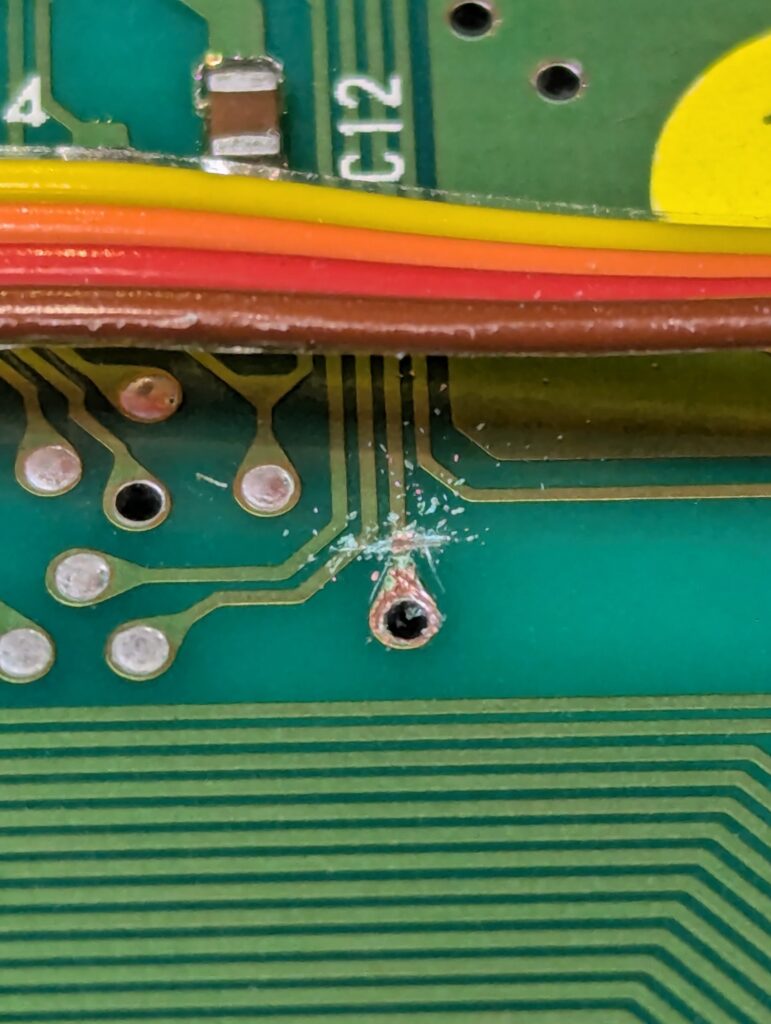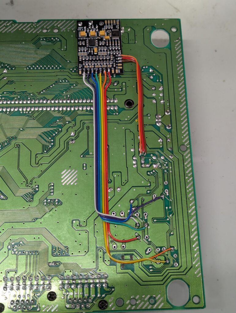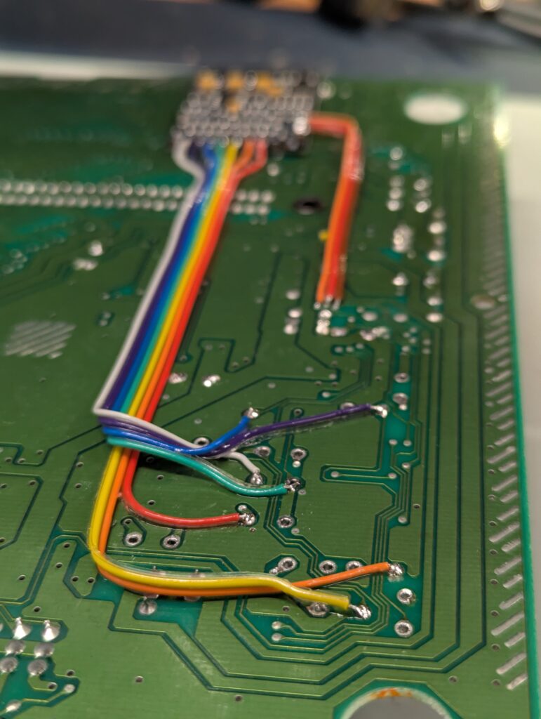 The next step is to prepare the TBP board on the back of the console, which requires to trim away some of the soldered elements around the area to allow for the board to sit flush so that the pins of the DIN connector can be routed through before soldering. After that, three wires for the RGB signal and 7 wires for the audio need to be soldered in.