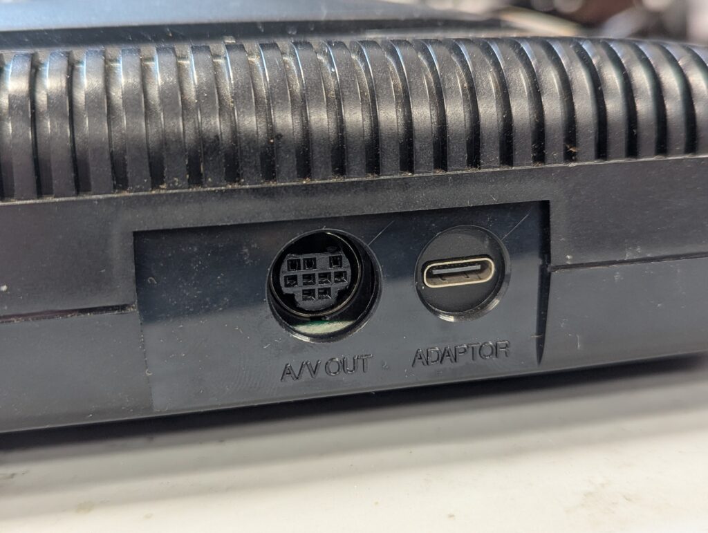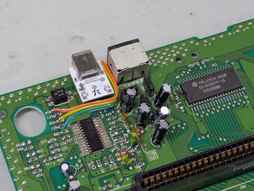 The USB power board was installed by removing the power jack, bridging the outer pins of the voltage regulator, and soldering the board in place. Note how the composite video was also rebuilt after installing the USB power board. This allows for composite video to be used (not just RGB) via the same DIN connector