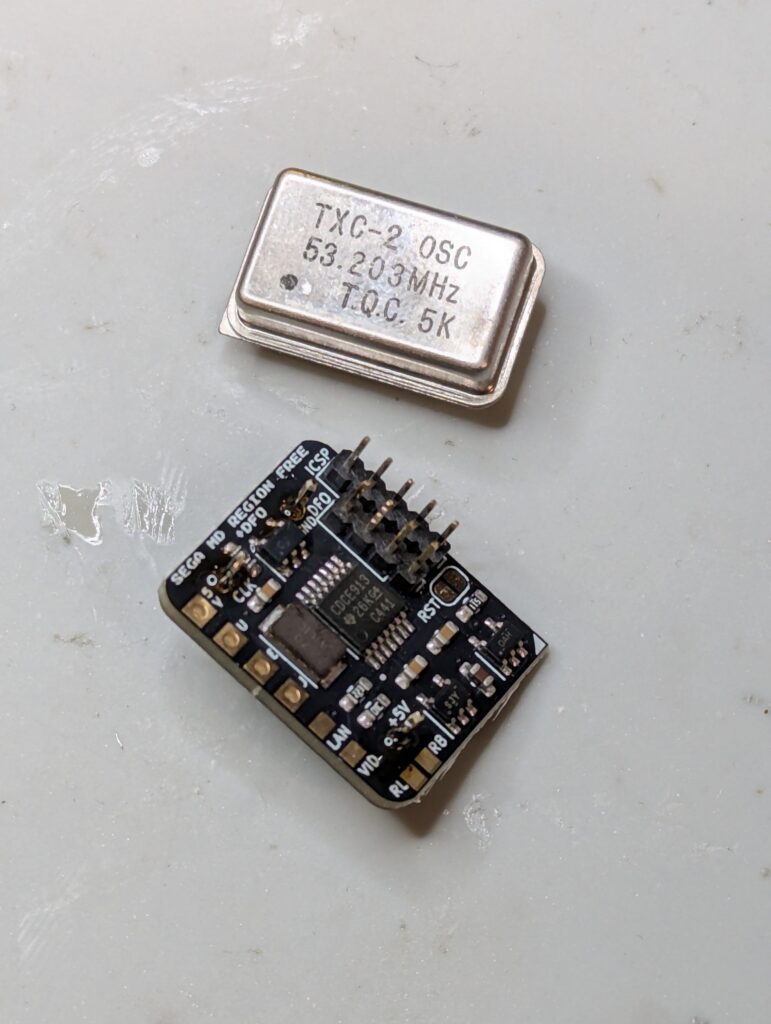 This mod requires to remove the stock clock and replace it with a new PCB. This PCB not just allows you to bypass region, but it also controls the right clock for the region that is selected. It also intercepts the RESET signal for swapping region (press for around 1s, quick press for actual reset). The mod requires not just the installation of the clock PCB and a new LED PCB (tri-colour Red, Green and Blue), but also requires the cutting of 3 traces.