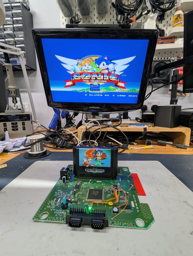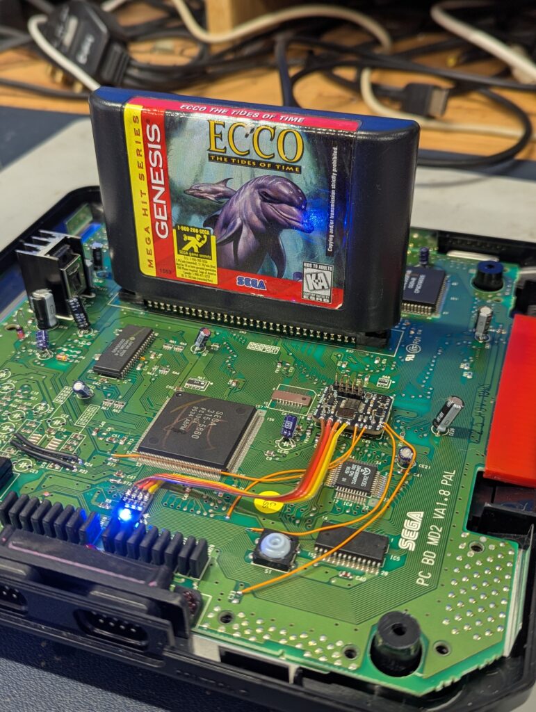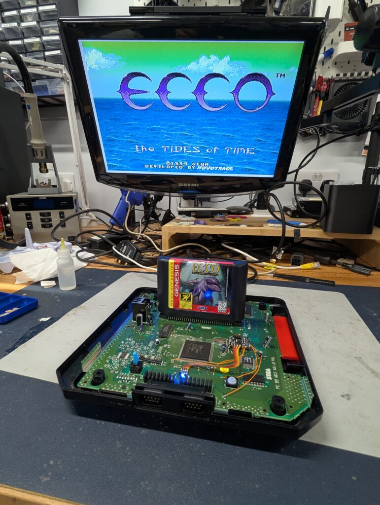 Testing shows the console in various region states as denoted by the coloud of the LED. Note how ECCO the dolphin is a USA NTSC game that is playing in this PAL console (otherwise a message saying that the game is not intended for this region is displayed). Note that all games can be played in any region, as the region-locking is disabled. The colour of the LEDs just controls the frequency of the clock.