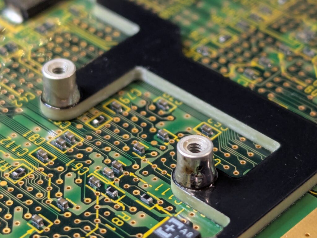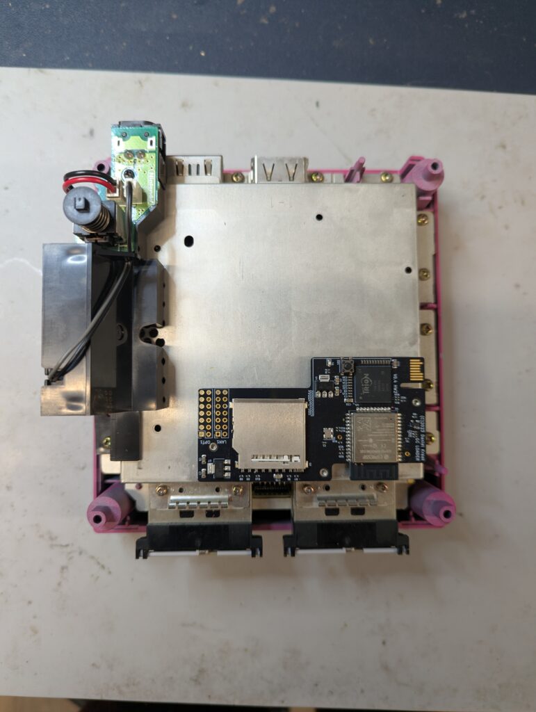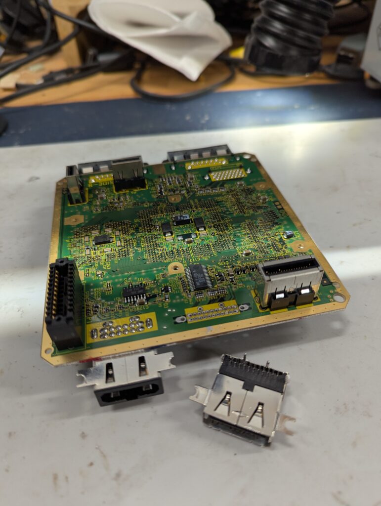 The next step was to remove the digital port to make space for the HDMI port. This is the no-cut version that the customer agreed to. After that, the bracket to install the holder for the GEM PCB was also installed using a few anchor points in the main Cube board. The two metal studs to screw the GEM PCB also need to be soldered in