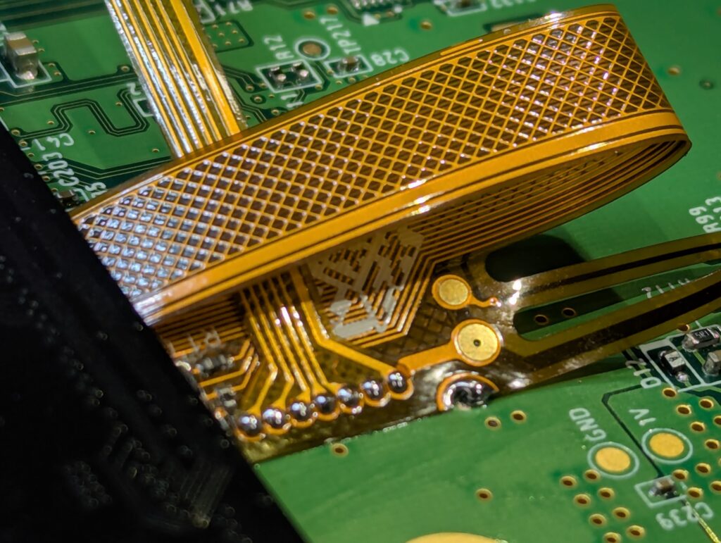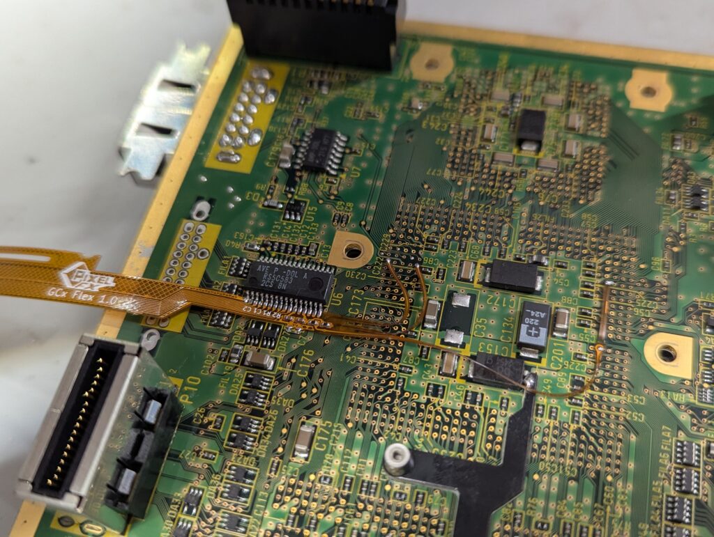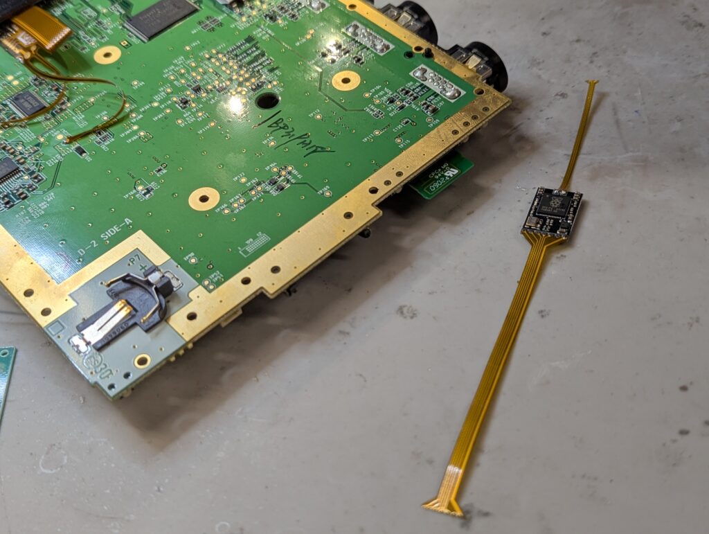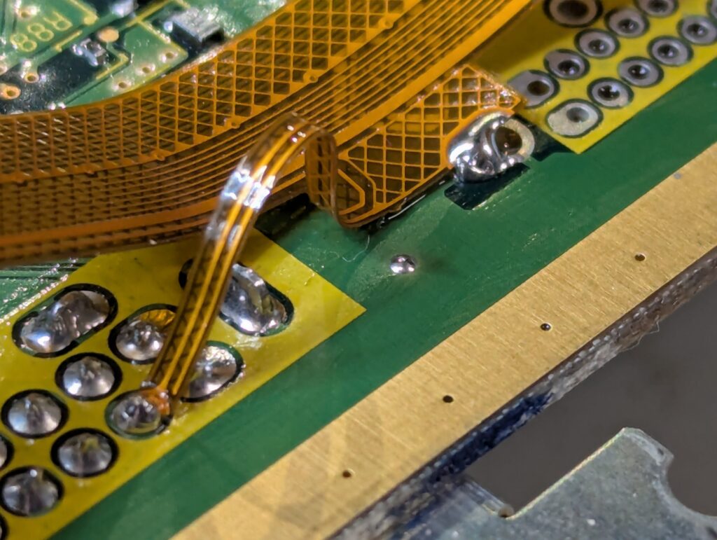 After this, the next step is to install the flex cable and solder it to the main video chip, as well to a few other points in the board for controller input, power and ground.