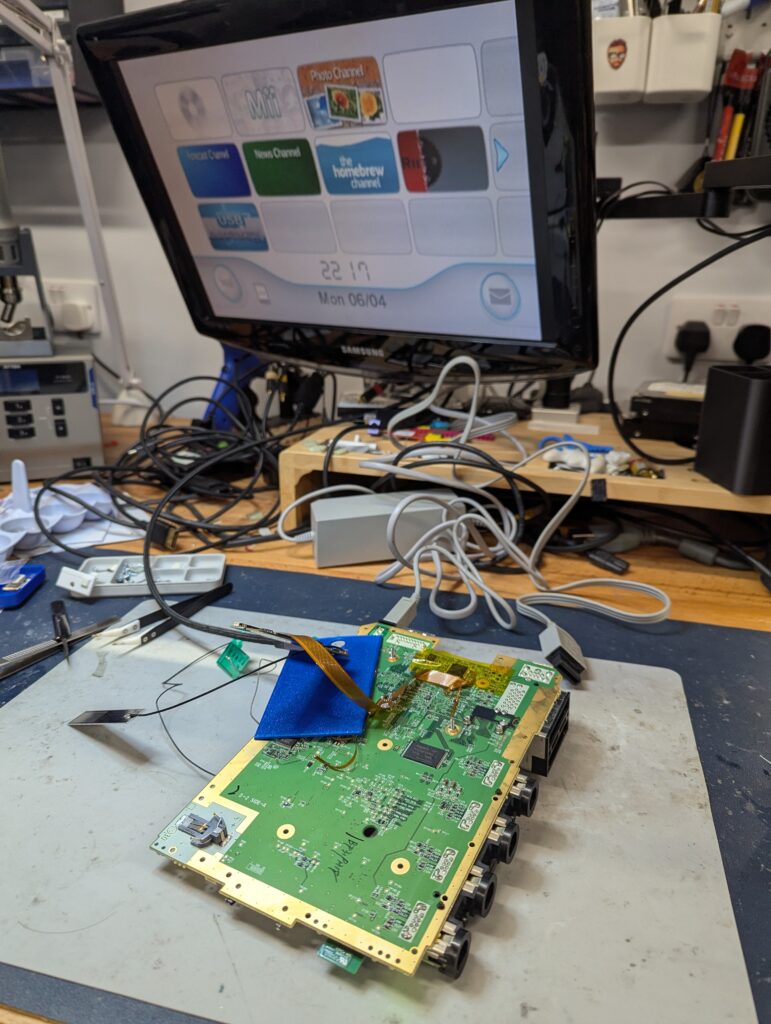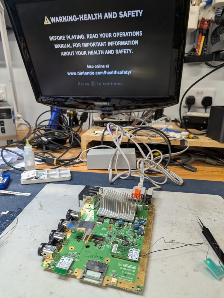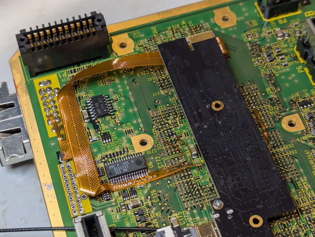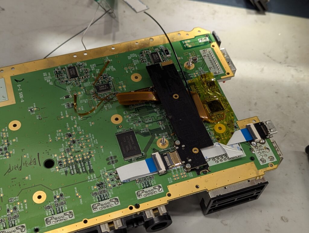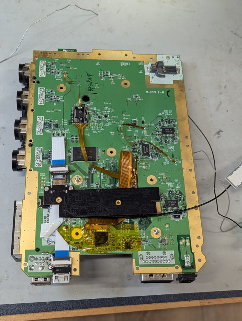 Then is time to install the flex. In this console, the video and audio chip (AVE) is really small and requires careful preparation of the pins and a small soldering iron. After installing the flex, the console should boot with composite, although is important to have the main processor heatsink connected. For this, I used a couple of temporal long screws and nuts. Note how the wireless cards are still plugged in, or the console won’t boot