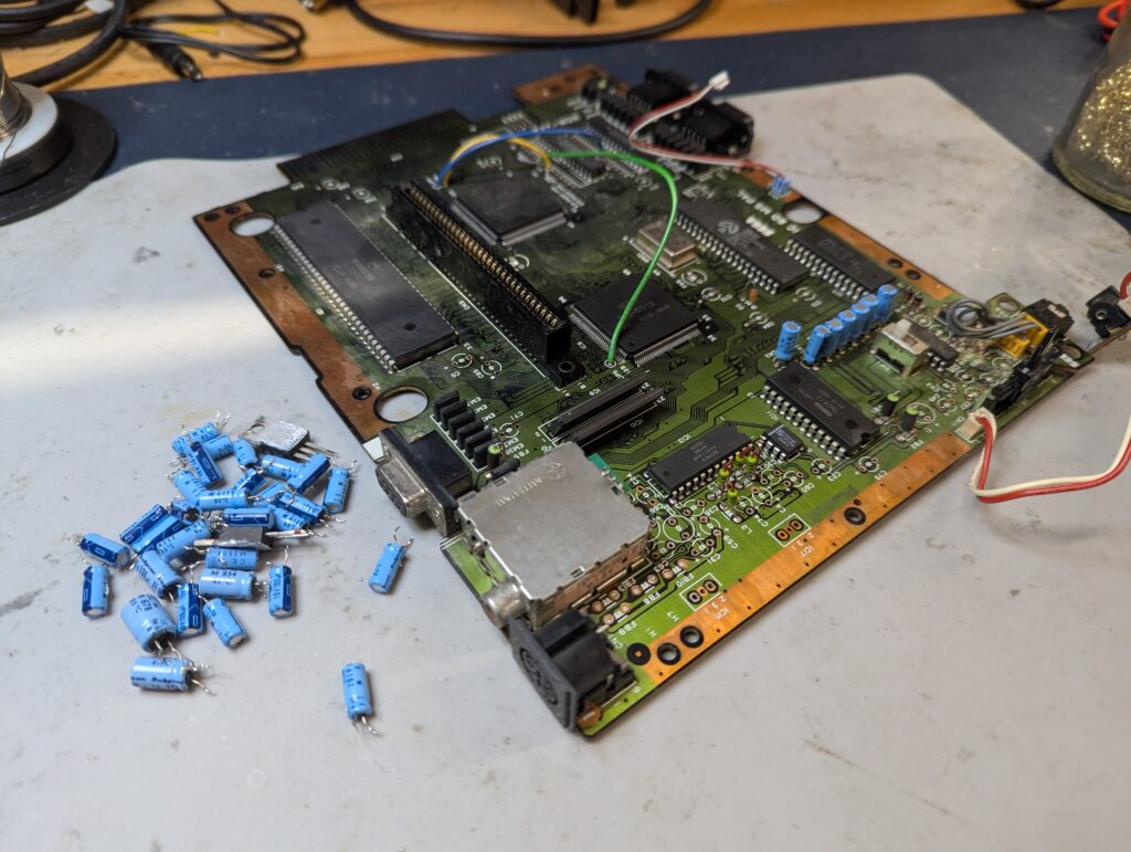 The first thing to be done after disassembly is a full recap minus the audio capacitors which need to be removed for the 3BP mod. In order to be able to test the console after recapping, the old audio capacitors (light blue) were left installed , bur removed for the 3BP mod (next step)