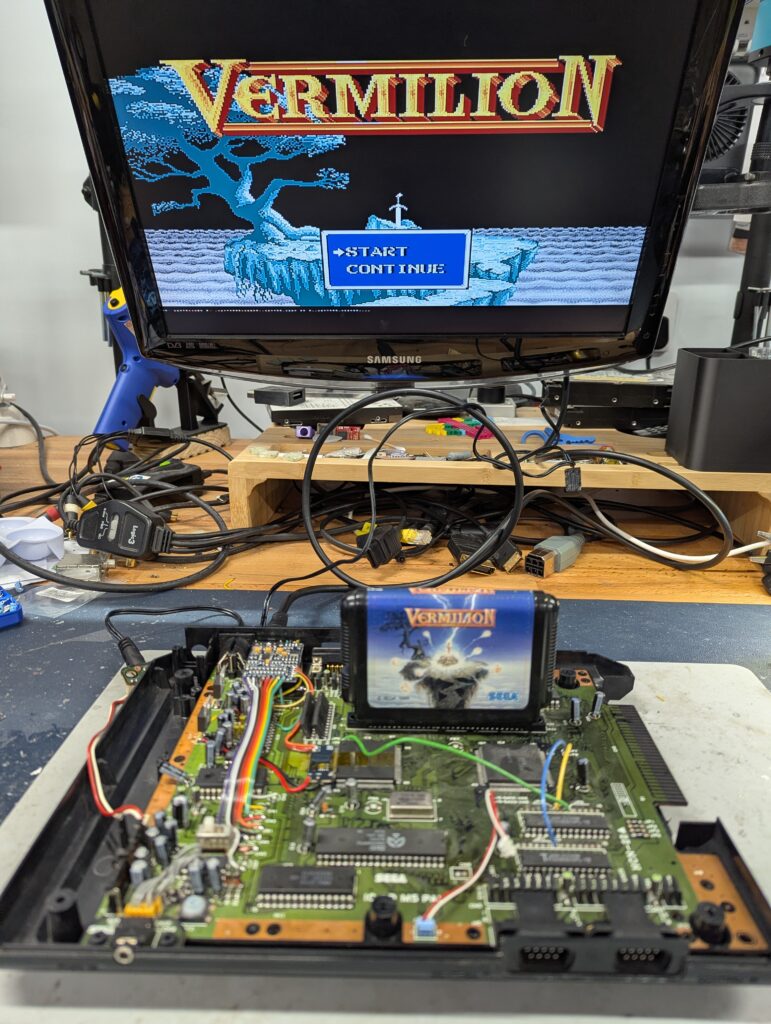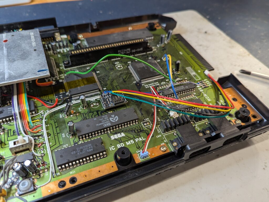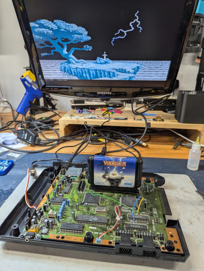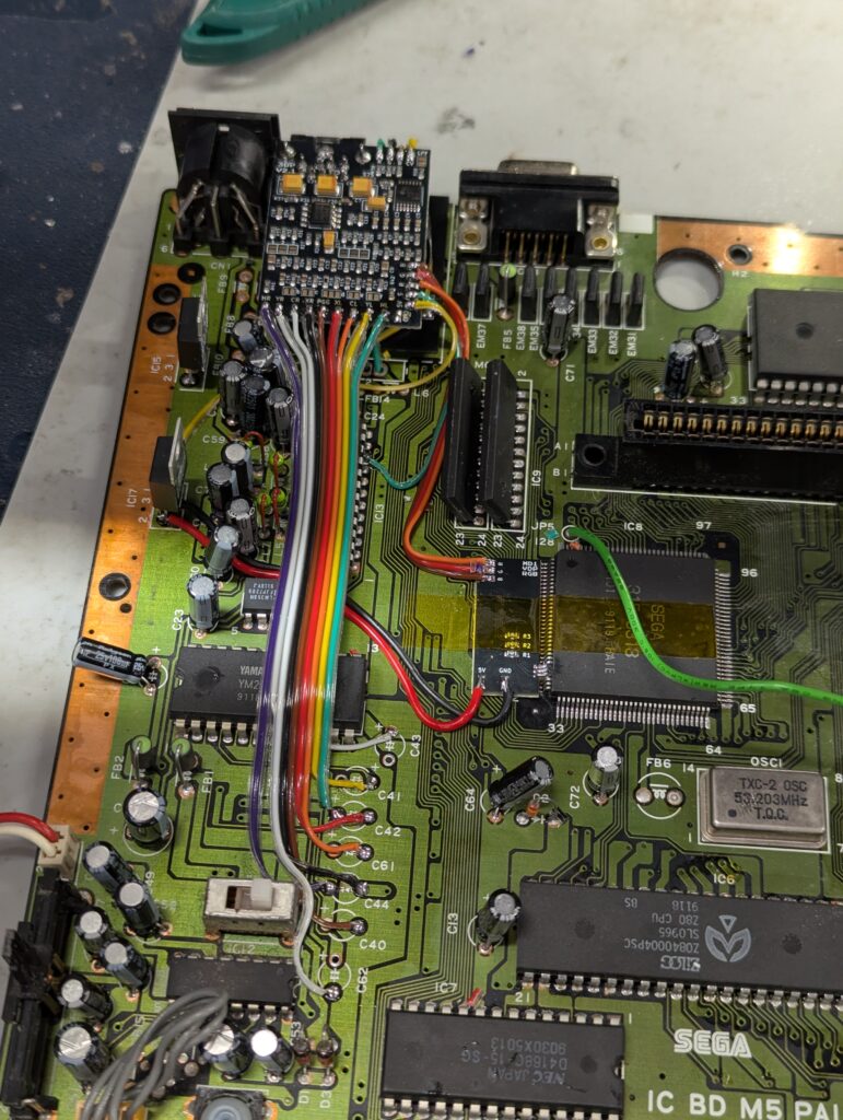 Next up is to connect the audio wires to the various pads of the capacitors we removed earlier. Testing proves that RGB through SCART as well as the headphone jack works great. There is no audio distortion.