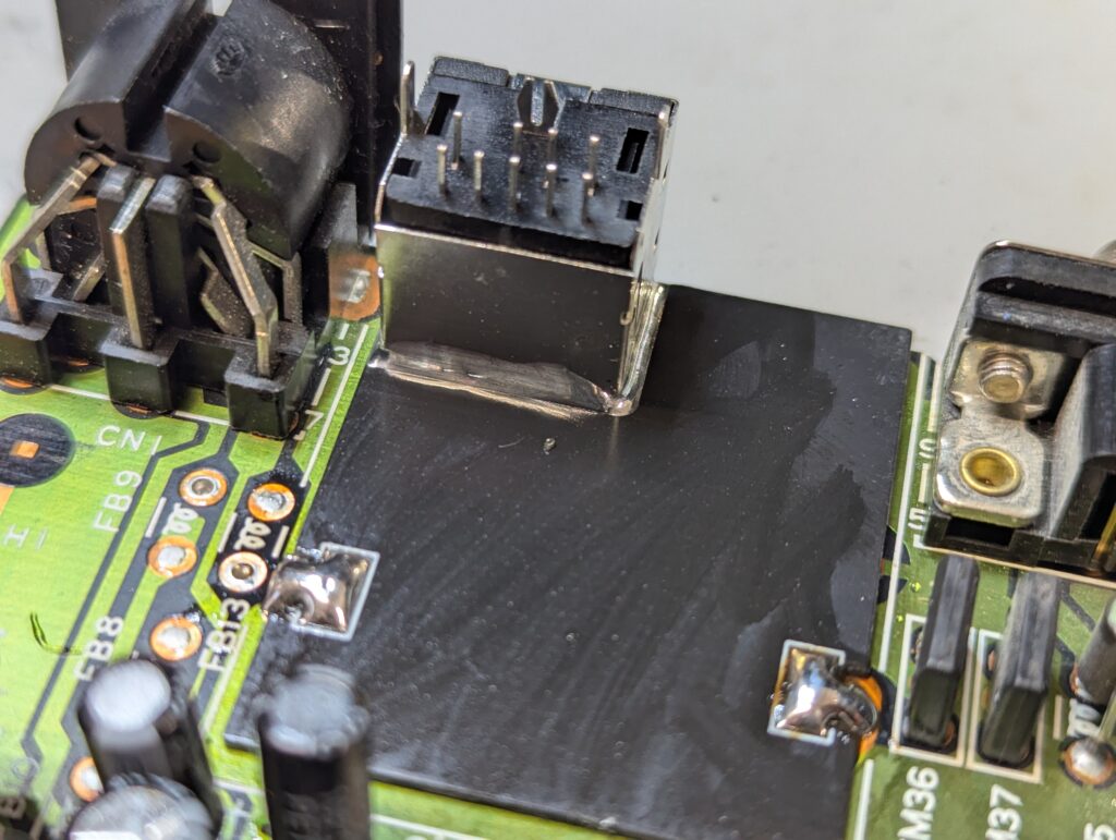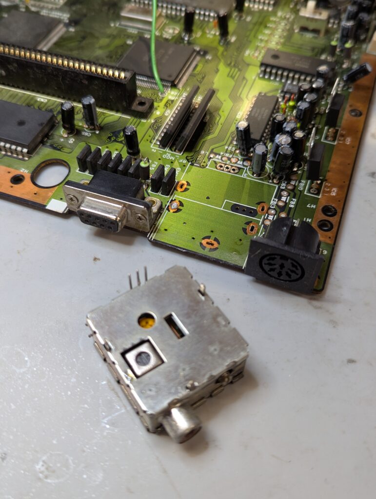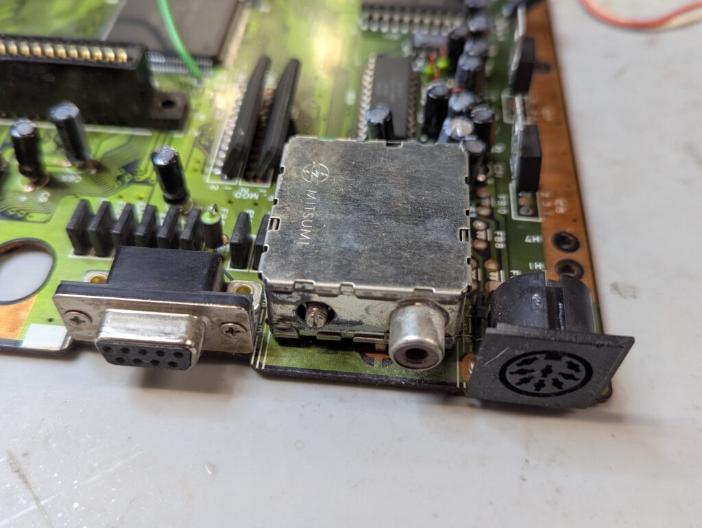 After the recap was confirmed to be successful, is time for the 3BP installation. First step is to remove those audio capacitor as well as the RF module. Then, in order to be able to place the new DIN9 connector, an interface board is soldered in place of the RF module and the DIN9 connector is soldered to it.