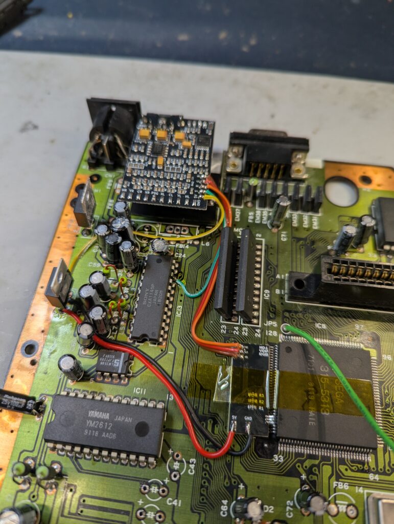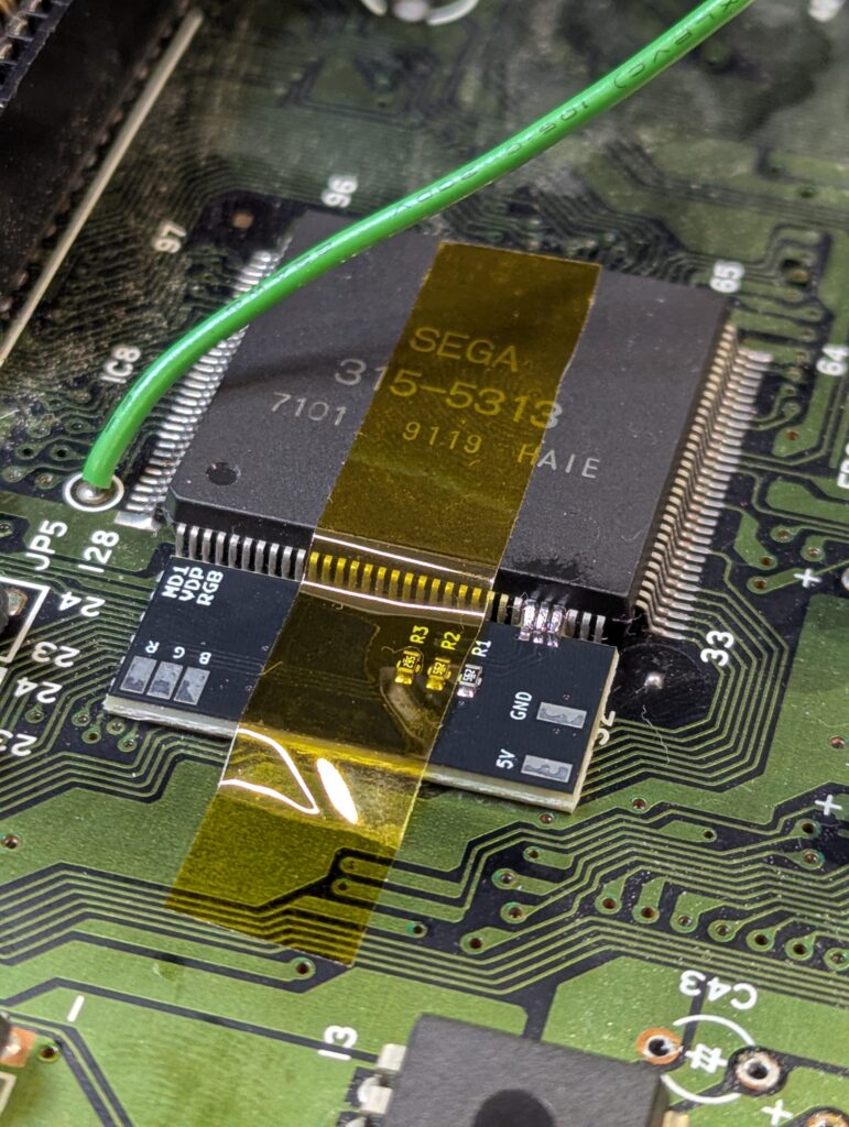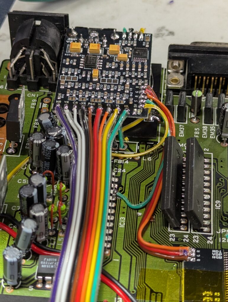 Next step is to lift the RGB pins on the video chip in order to connect them to the 3BP through an interface board. Then, the 3BP board needs to be soldered on top of the DIN9 pin, and the interface board needs to be connected to ground and 5v from one of the voltage regulators, and also to the 3BP board RGB pads. The 5V and the sync signal also need to be connected to the 3BP board (green and yellow cables in the picture below)