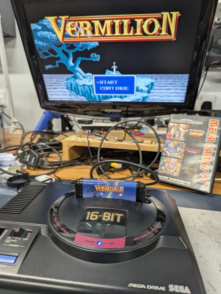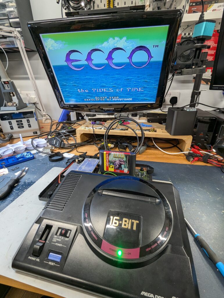 The console can now be placed in the right region by pressing and holding the reset button. The LED colour will cycle between green (US), red (EU) and blue (JP). Note that some games will not run in the wrong region. Finally the console was tested and given a wipe.