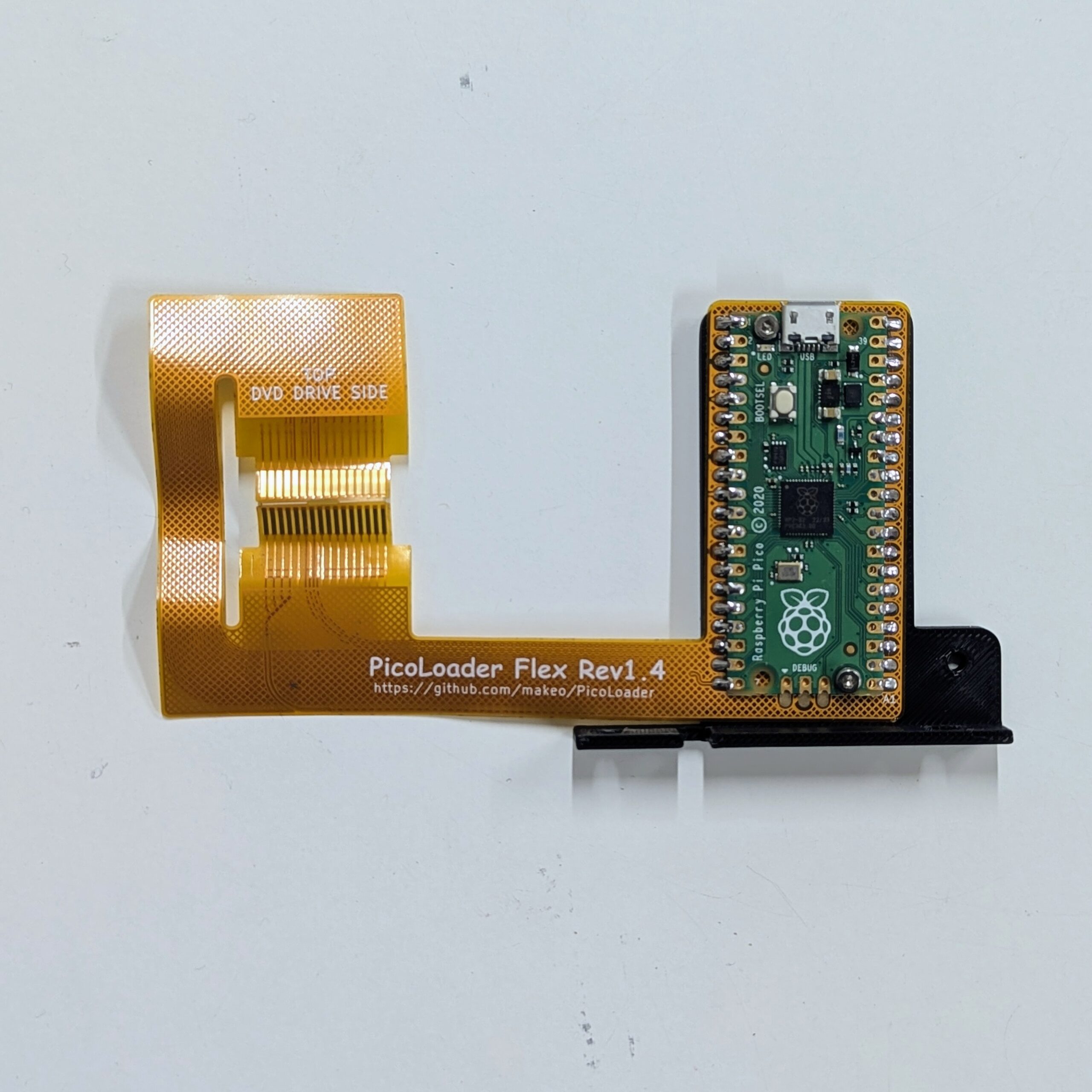 This kit includes a PicoLoader Rev 1.4 flex cable, with a pre-soldered Raspberry Pi and diode, and already screwed into a 3D-printed bracket.